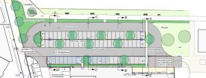 Gegenüber der ersten Vorstellung im Bauausschuss am 08.08.2018 (Entwurf Nr. 1) war hier lediglich die Anzahl und die Anordnung der Bäume geändert.