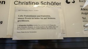 Die Praxis Schäfer ist von einem Tag auf den anderen ohne Vorwarnung und bis auf Weiteres geschlossen.